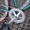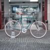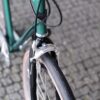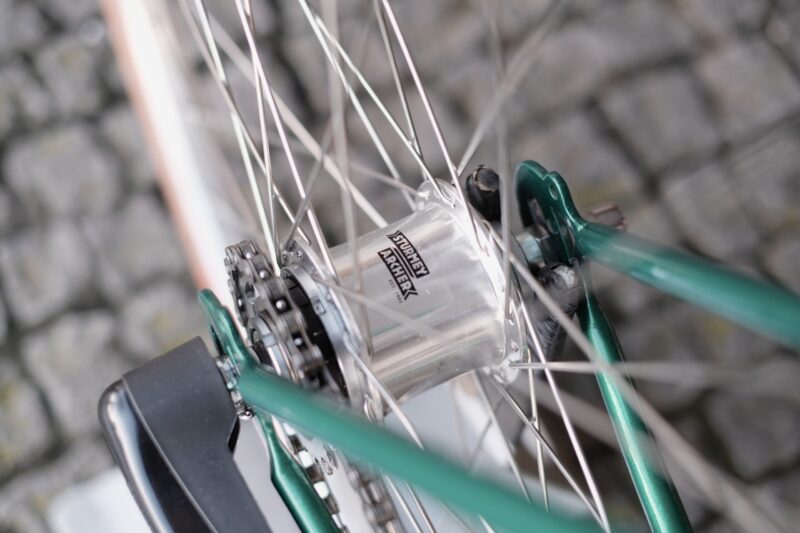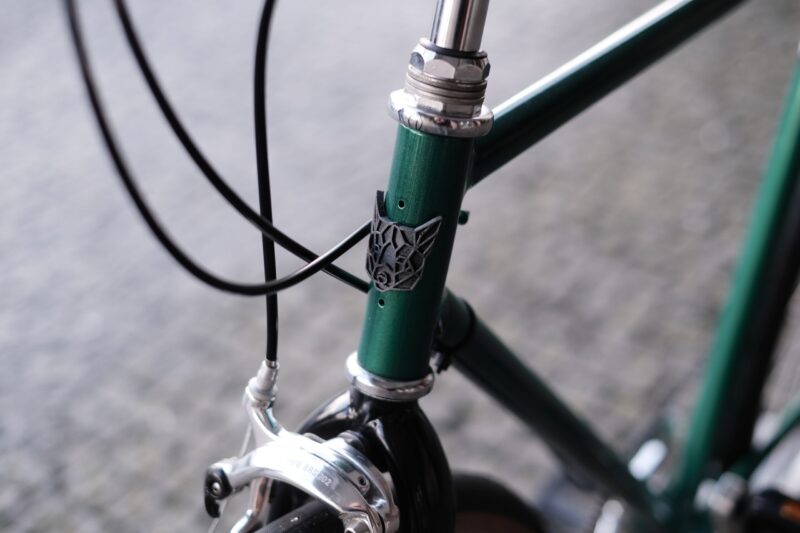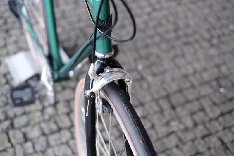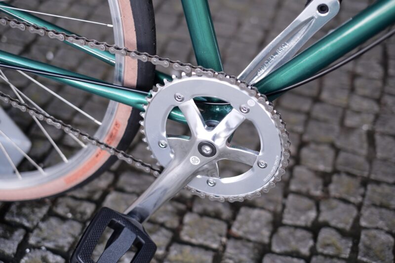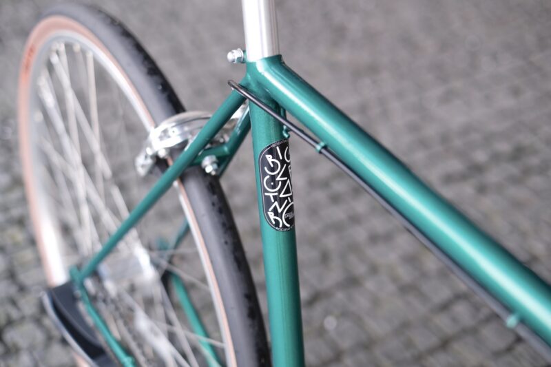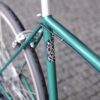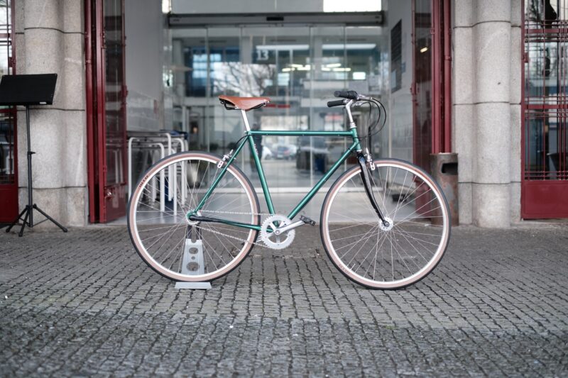 No caso deste trabalho, o Pedro pensou na bicicleta que adoraria ter nos seus percursos citadinos. Imaginada para as ruas de Matosinhos, esta bike começou por ser apenas um quadro de aço, perdido na nossa oficina. A cor escolhida para lhe dar vida foi este verde esmeralda, que conjugamos com uma forqueta preta.